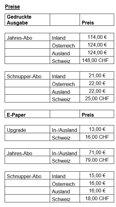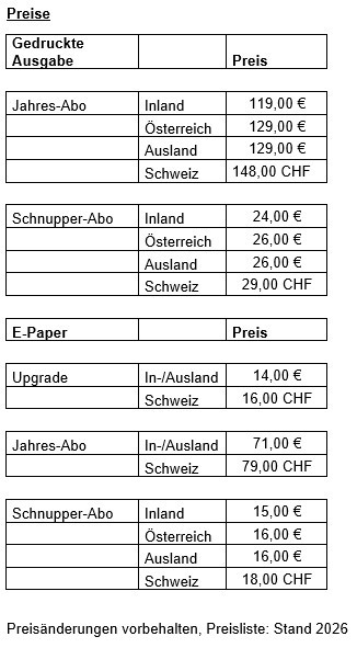 Studierende erhalten 25 % Rabatt auf das persönliche Abo in der gedruckten Ausgabe oder als E-Paper. Eine Kopie des Ausbildungsnachweises ist erforderlich. Rechnungs- und Lieferadresse müssen identisch sein. Dieses Abo ist nach 12 Monaten (12 Ausgaben) monatlich kündbar.
