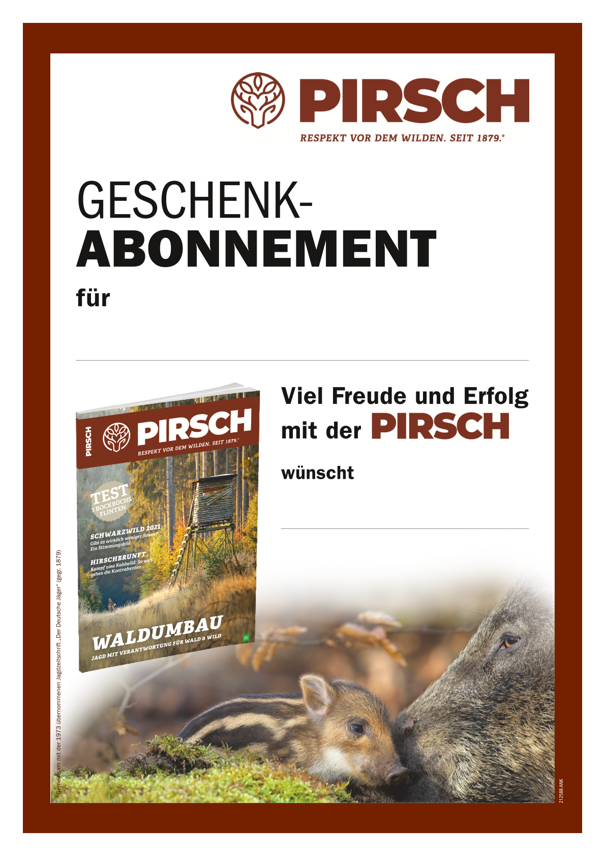 Machen Sie Freunden, Verwandten und Bekannten eine Freude und verschenken Sie 1 Jahr PIRSCH . Der Beschenkte erhält alle Ausgaben versandkostenfrei nach Hause geliefert. Wählen Sie zwischen Print, Digital oder einer Kombination aus beidem.
