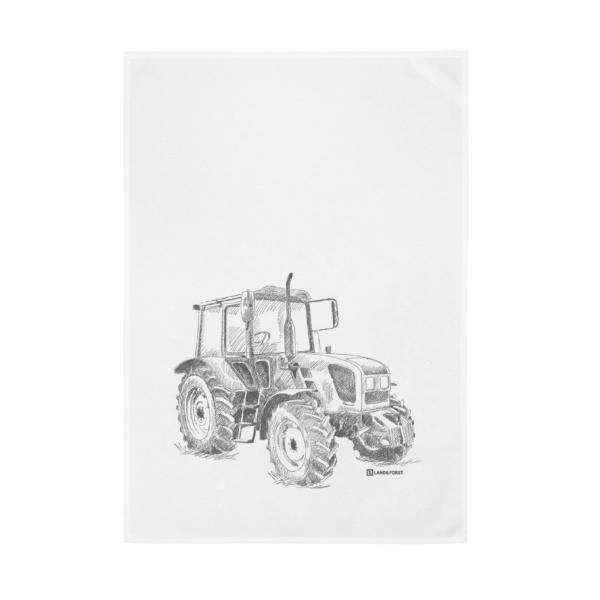 Das handbedruckte Geschirrtuch mit dem starken Trecker-Motiv ist ein echter Blickfang für jede Küche.