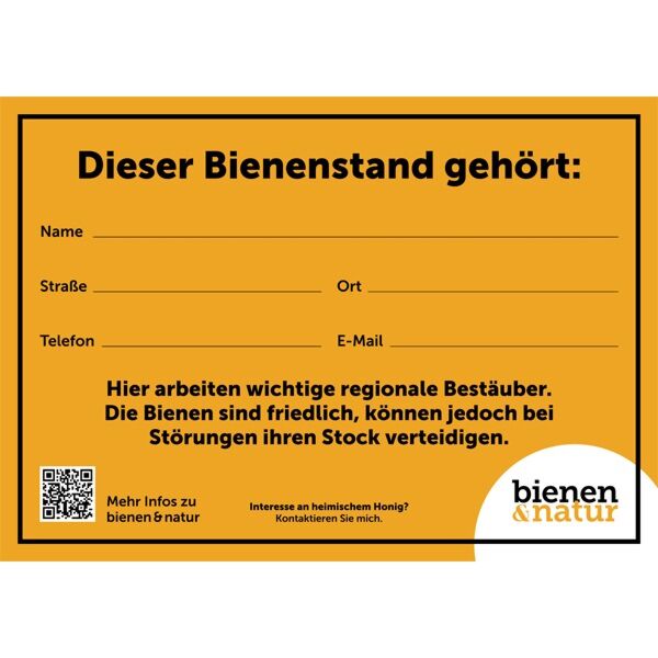 Infoschild für den Bienenstand im Format DIN A4 (ca. 21 x 29,7 cm) als witterungsbeständige Alu Dibond Platte (ca. 3 mm) mit Ecklochbohrung. Dank UV-Lack und Alu Dibond Material ist das Infoschild optimal auf die extremen Witterungsbedingungen im Außenbereich ausgelegt.
