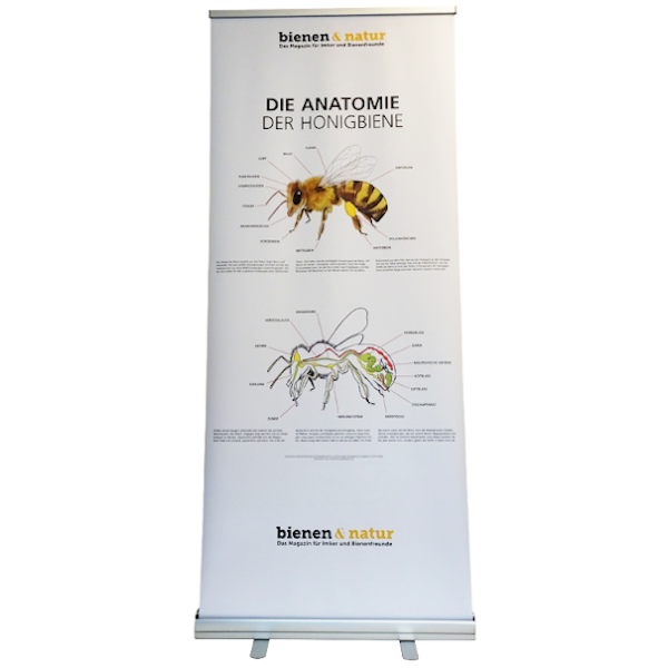 Anschauliche Informationen über den äußeren und inneren Körperbau der Bienen. Premium Roll-Up Bannerdisplay Format 85x200 cm
