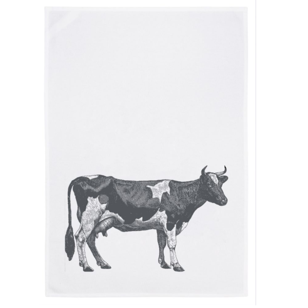 Das handbedruckte Geschirrtuch mit dem sympathischen Kuh-Motiv ist ein echter Blickfang für jede Küche.