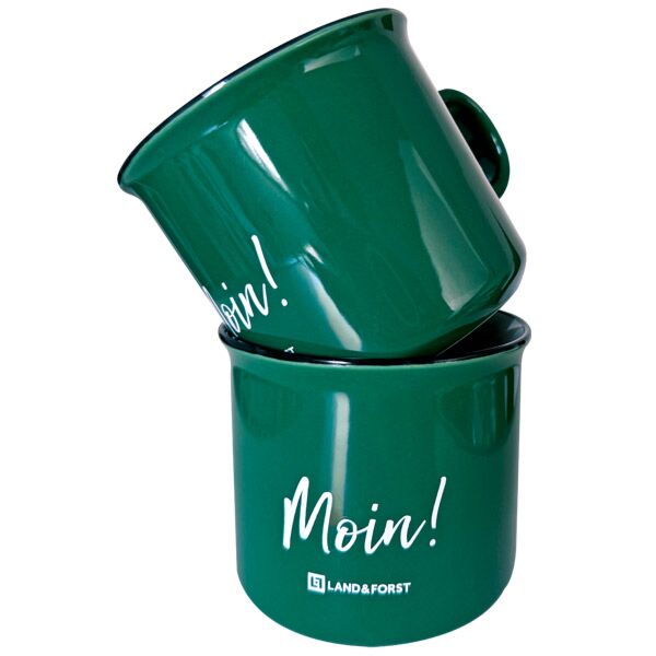 Ob Frühaufsteher oder Langschläfer – die Kaffeetasse mit der plattdeutschen Begrüßung „Moin!“ passt immer. Die Gestaltung ähnelt einem Emaillebecher, durch die Ausführung in Keramik macht sich der Becher aber auch auf dem Frühstückstisch oder der Kaffeetafel gut. Außen ist der Becher dunkelgrün, innen weiß und der Rand oben ist schwarz. Er fasst ein Volumen von 300 ml.