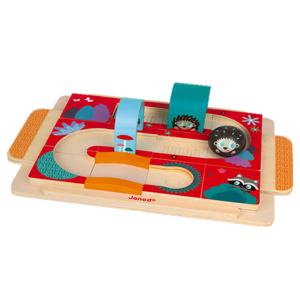 Rennstrecke zum Zusammensetzen mit einem mobilen Tablett und 12 doppelseitigen Streckenelementen. Wenn das Kind den großen Igelball über den Weg rollt, fördert es seine Augen-Hand-Koordination und seine Feinmotorik. Die Teile sind abnehmbar und können auch außerhalb des Tabletts verwendet werden.