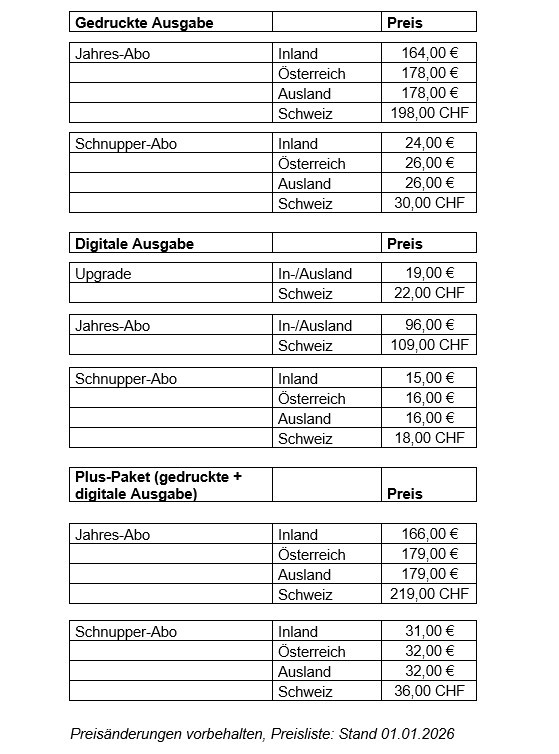 Studierende und Auszubildende erhalten 25 % auf den Jahresbezugspreis, vgl. Preisliste. Hierfür benötigen wir jeweils zur Rechnungsstellung eine aktuelle Immatrikulations- bzw. Ausbildungsbescheinigung. Wird uns diese Bescheinigung nicht zur Verfügung gestellt, berechnen wir den regulären Bezugspreis. Rechnungs- und Lieferadresse müssen identisch sein.