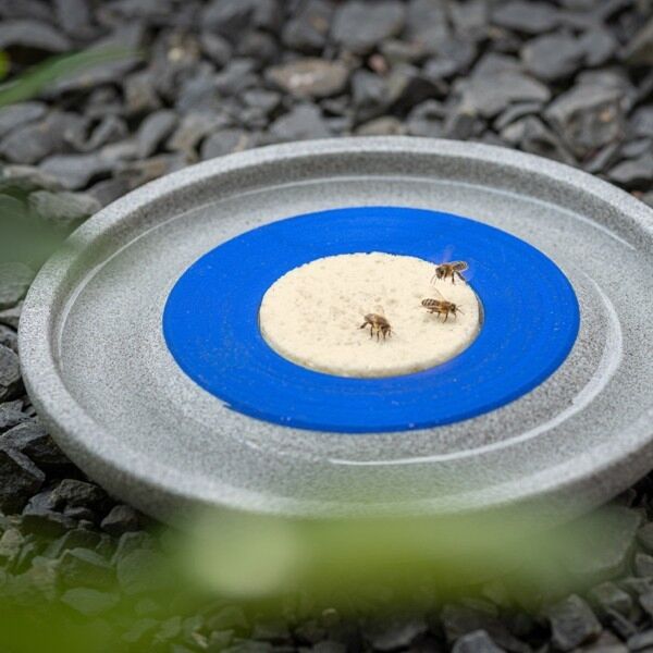 Diese handgefertigte und langlebige Insektenstation aus hochwertigem Granit ist Tränke und Futterstelle in einem. Fluginsekten werden durch die blaue Bemalung angelockt. Der mitgelieferte Schwamm in der Mitte wird mit Sirup (z.B. verdünnter Fruchtsaft) als Nektarersatz getränkt. Auf den inneren Rand kann Festfutter (z.B. Fruchtstücke) gelegt werden. Die umlaufende Wasserrinne dient als Tränke und schützt das Futter gleichzeitig vor Ameisen.