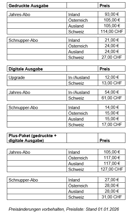 Studierende und Auszubildende erhalten 25 % auf den Jahresbezugspreis, vgl. Preisliste. Hierfür benötigen wir jeweils zur Rechnungsstellung eine aktuelle Immatrikulations- bzw. Ausbildungsbescheinigung. Wird uns diese Bescheinigung nicht zur Verfügung gestellt, berechnen wir den regulären Bezugspreis. Rechnungs- und Lieferadresse müssen identisch sein.